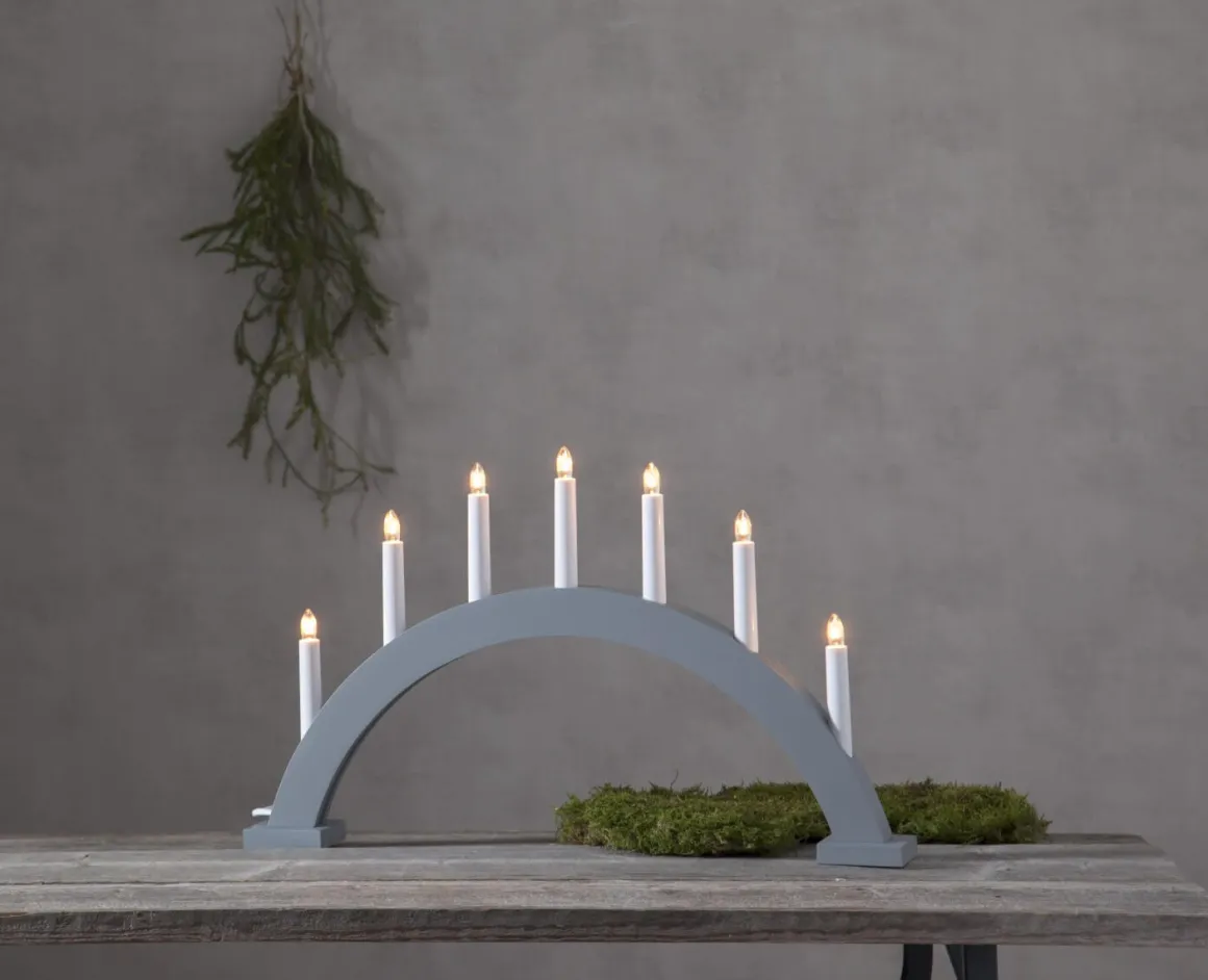 Ljusgrå bågformad träljusstake med 7 ljus. Med sin enkla och stilrena design passar den utmärkt i både hem å stuga.