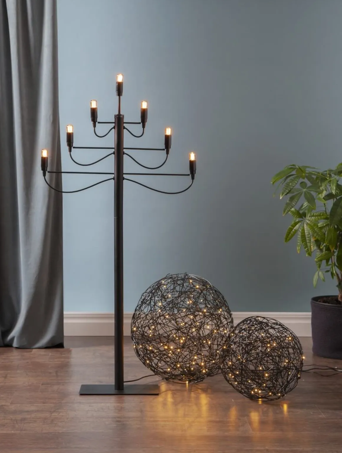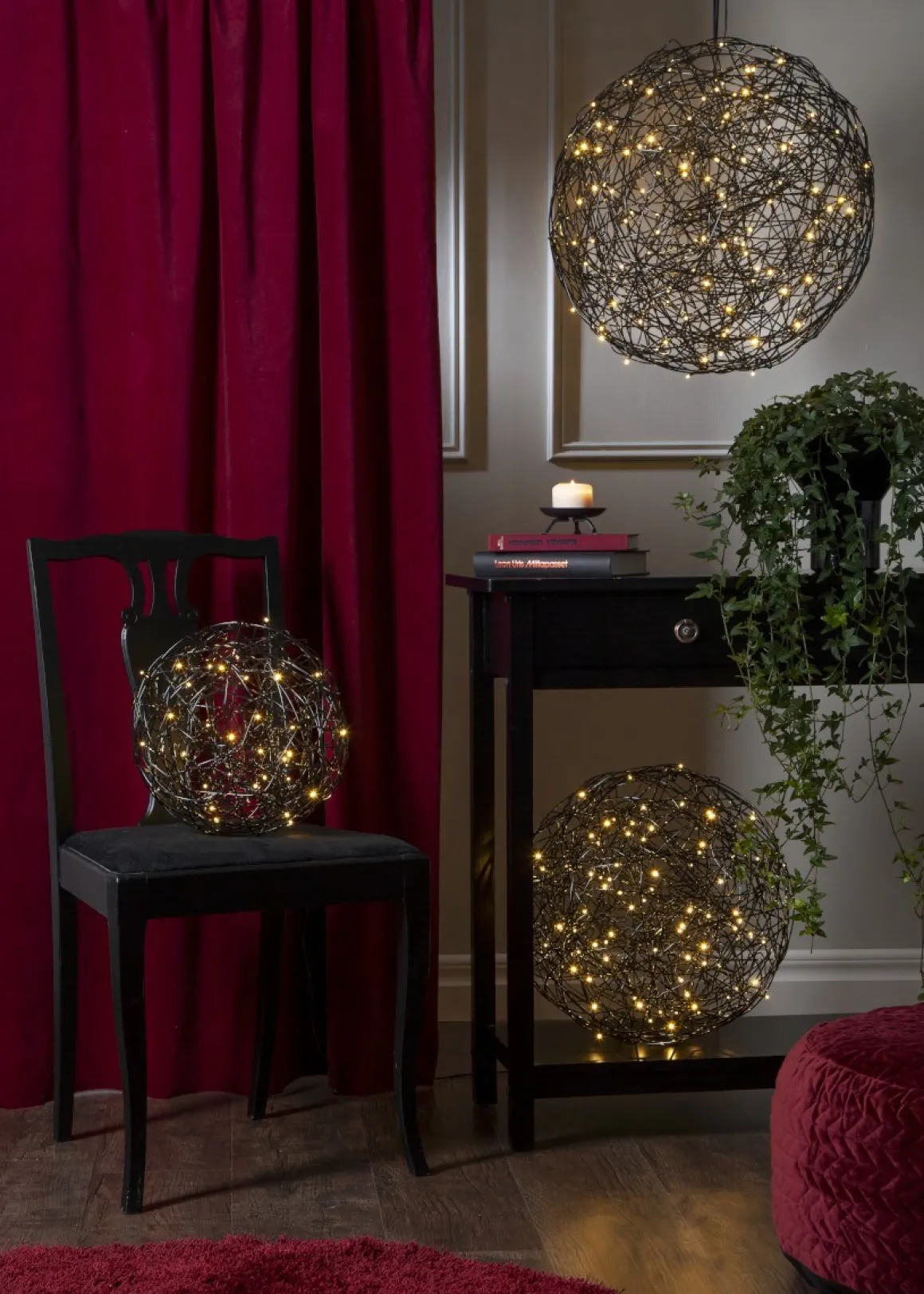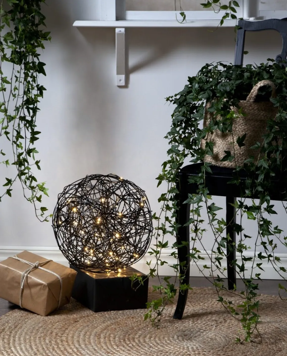 Dekorativ svart version av Trasselbollen för både inom- och utomhusbruk. Inuti dekorationen finns en LED-ljusslinga med 50 stycken små ljuspunkter som avger ett varmvitt sken. Designad av Charlotte Falck.