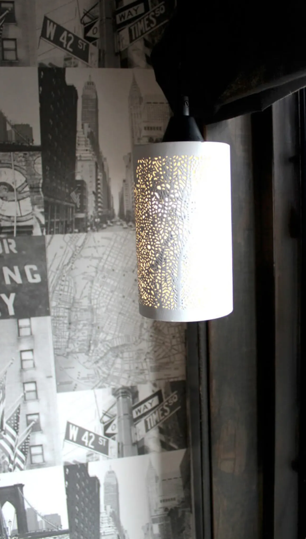 Vit fönsterlampa från Oriva i laserskuren tunn metall som bildar formen av ett träd som blir extra tydligt när lampan är tänd.