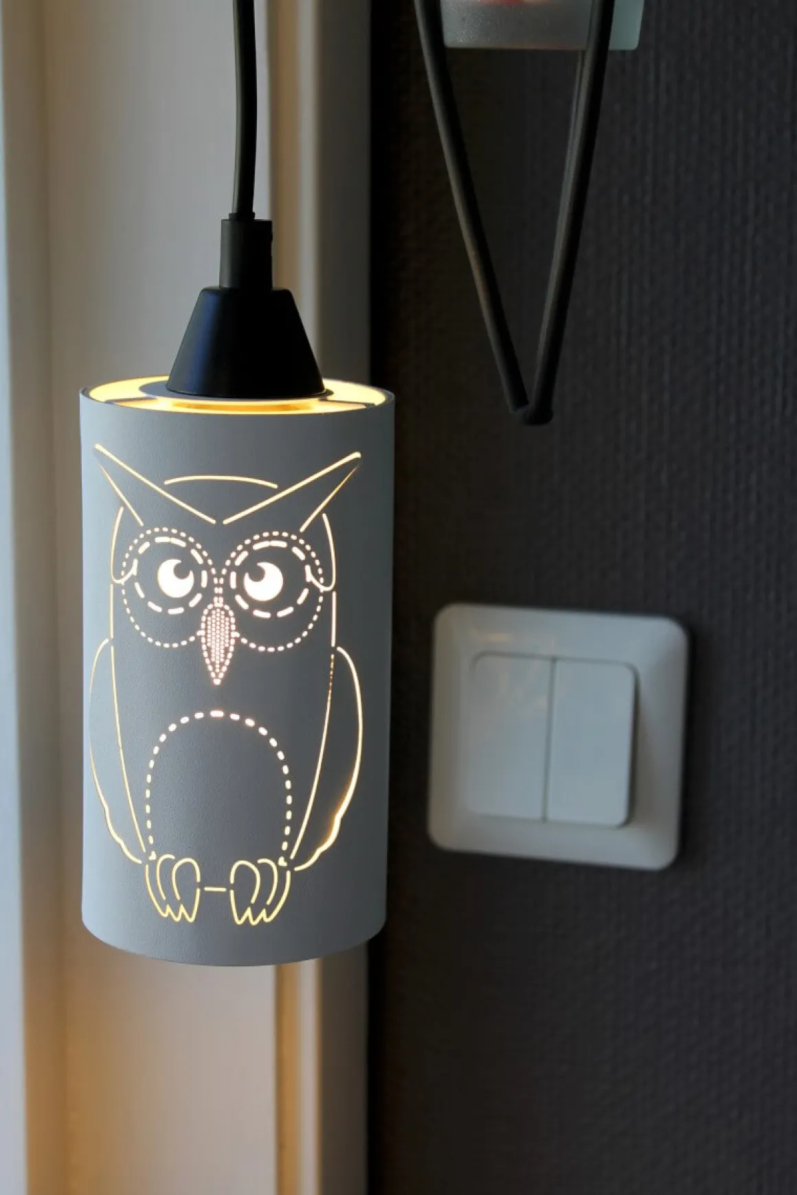 Vit laserskuren fönsterlampa med ugglemotiv som lyser upp i mörkret, perfekt i barnrummet.