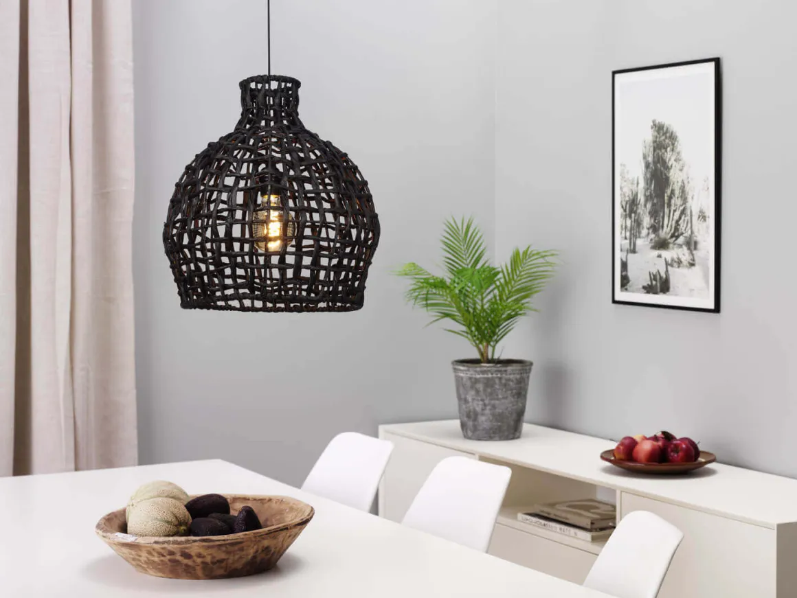 Sååå läcker takskärm gjord av svart flätad vattenhyacint. Komplettera med en cool dekoration LED-ljuskälla för att sätta din egna personliga touch. Eftersom skärmen är gjord i naturmaterial går den även att ha ute men trivs då ändå bäst under tak 🙂 Upphängför E27-ringfäste ingår ej.