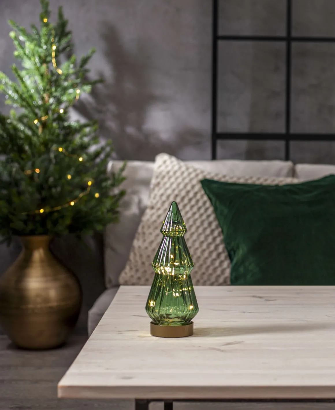 Elegant batteridriven bordsdekoration i form av en gran i transparent mörkt grönt glas. Den guldfärgade basen döljer batteriboxen och ger ett vackert sken, perfekt som juldekoration på exempelvis julbordet. Drivs av 3 AAA-batterier. Finns i två storlekar, se även artikelnummer 460-37 om du vill kombinera..
