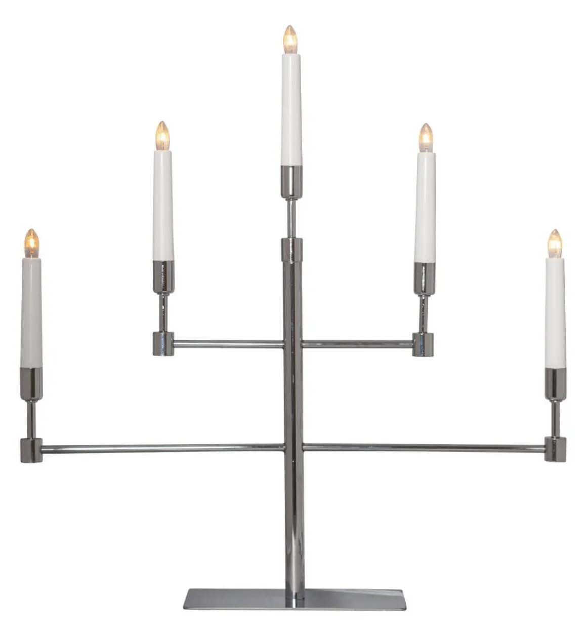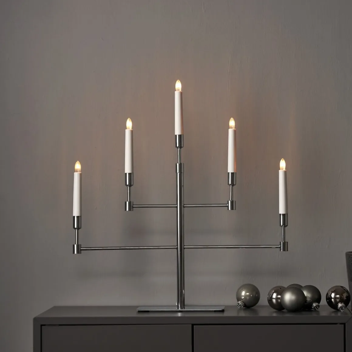 Modern och stilren adventsljusstake i krom från Star Trading, Vide är tillverkad i metall och har 5 stycken ljuskällor. När enkelhet och stilrent är ledordet så är Vide ett perfekt val.