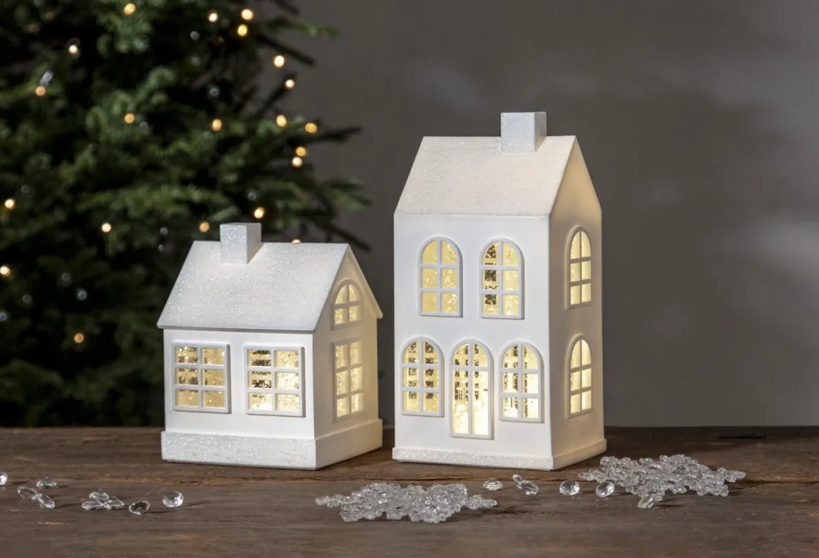 Glittrande, vattenfylld lykta från Star Trading med formen av ett litet hus på 22,5 centimeter med glittrande vintertak. Glitter vätskan är i rörelse när produkten är påslagen, lyser glittrande vackert med ett varmt och behagligt sken. Placera på ett bord eller en hylla för en ljuvlig julstämning. Kombinera gärna med Vinter hus 15,5 cm.