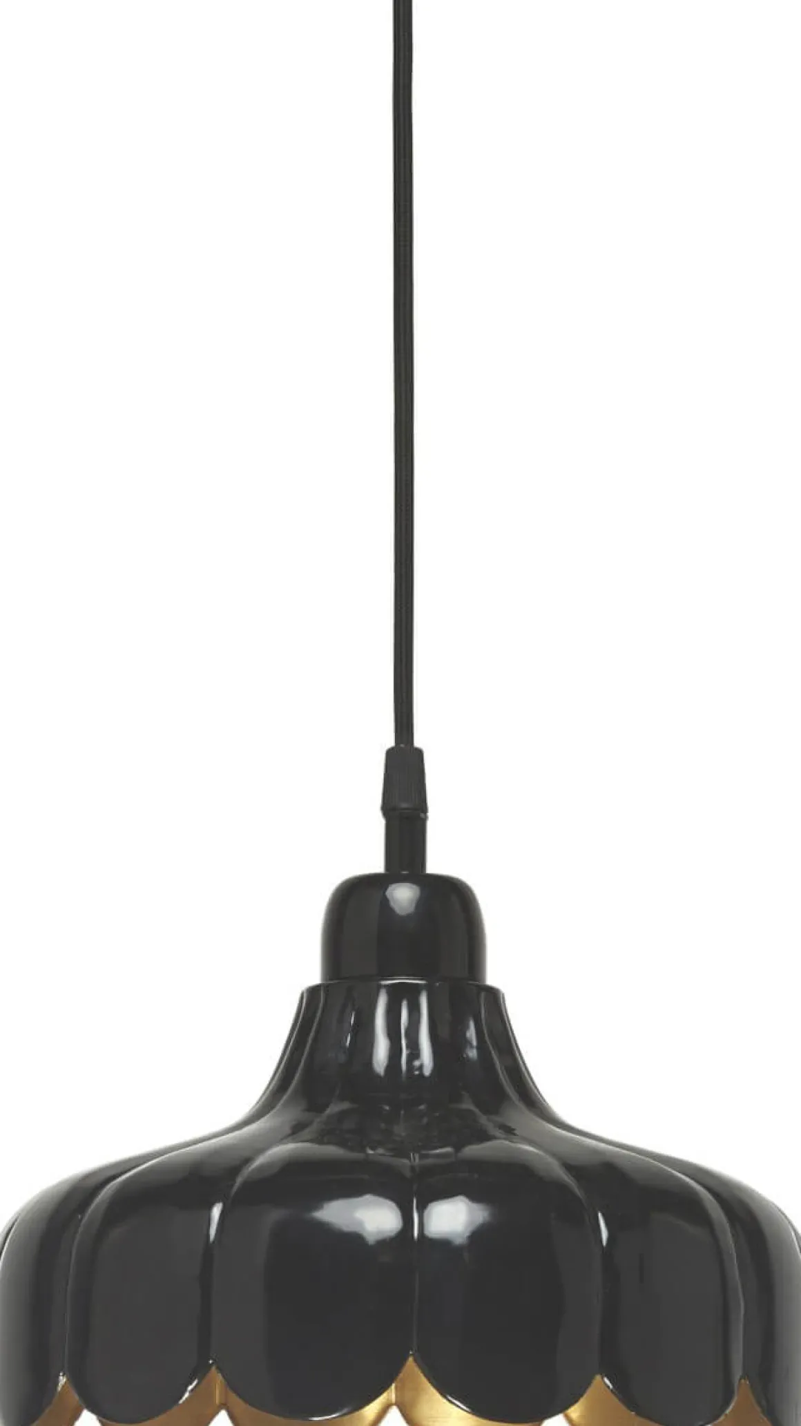 PR-Homes nya serie Wells ger en fräsch romantisk känsla i ditt hem. De har tydligt inspirerats av en blomma och skapat denna serie med taklampa, fönsterlampa och bordslampa i4 färger, rosa, grön, vit och svart. Alla har en guldfärgad insida som sprider ett varmt härligt sken. Varje skärm är handgjord. Wells kommer pryda ditt hem med sina feminina former och läckra färger. Här ser du tak/fönsterlampan i svart.