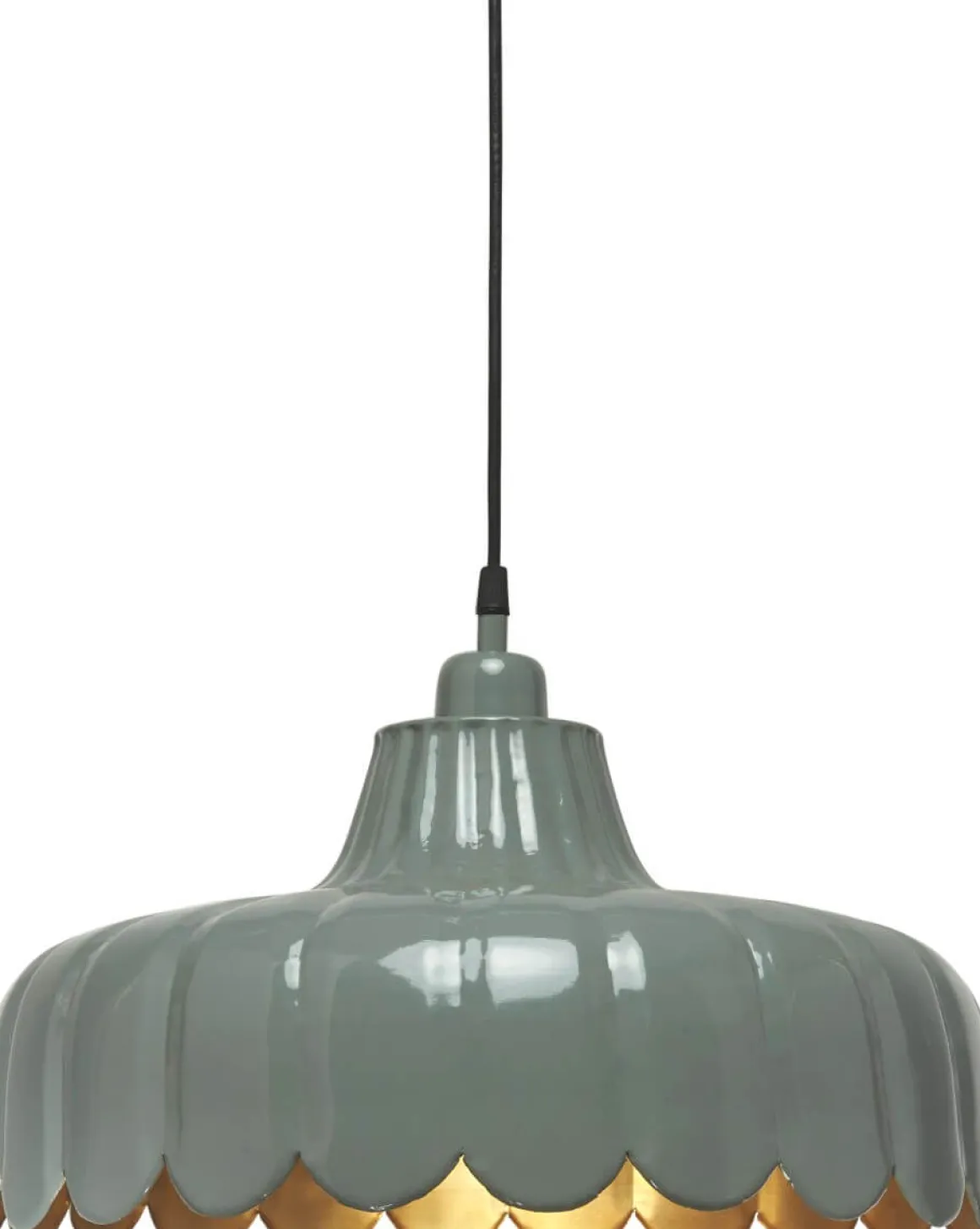 PR-Homes nya serie Wells ger en fräsch romantisk känsla i ditt hem. De har tydligt inspirerats av en blomma och skapat denna serie med taklampa, fönsterlampa och bordslampa i 4 färger, rosa, grön, vit och svart. Alla har en guldfärgad insida som sprider ett varmt härligt sken. Varje skärm är dessutom handgjord. Wells kommer pryda ditt hem med sina feminina former och läckra färger. Här ser du taklampan i grön.