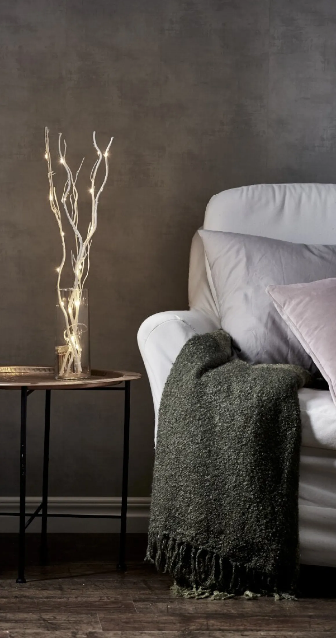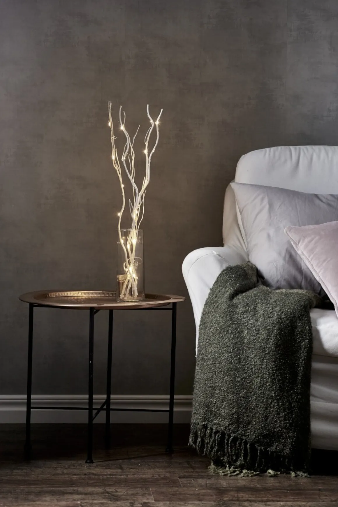 Batteridriven naturfärgad dekorationskvist med den läckra dew drop slingan invävd bland grenarna. En vacker inomhusdekoration som ger rummet en fin inredning med ljus. Kvisten har 24 LED-ljuskällor.