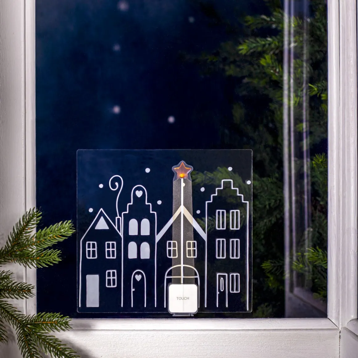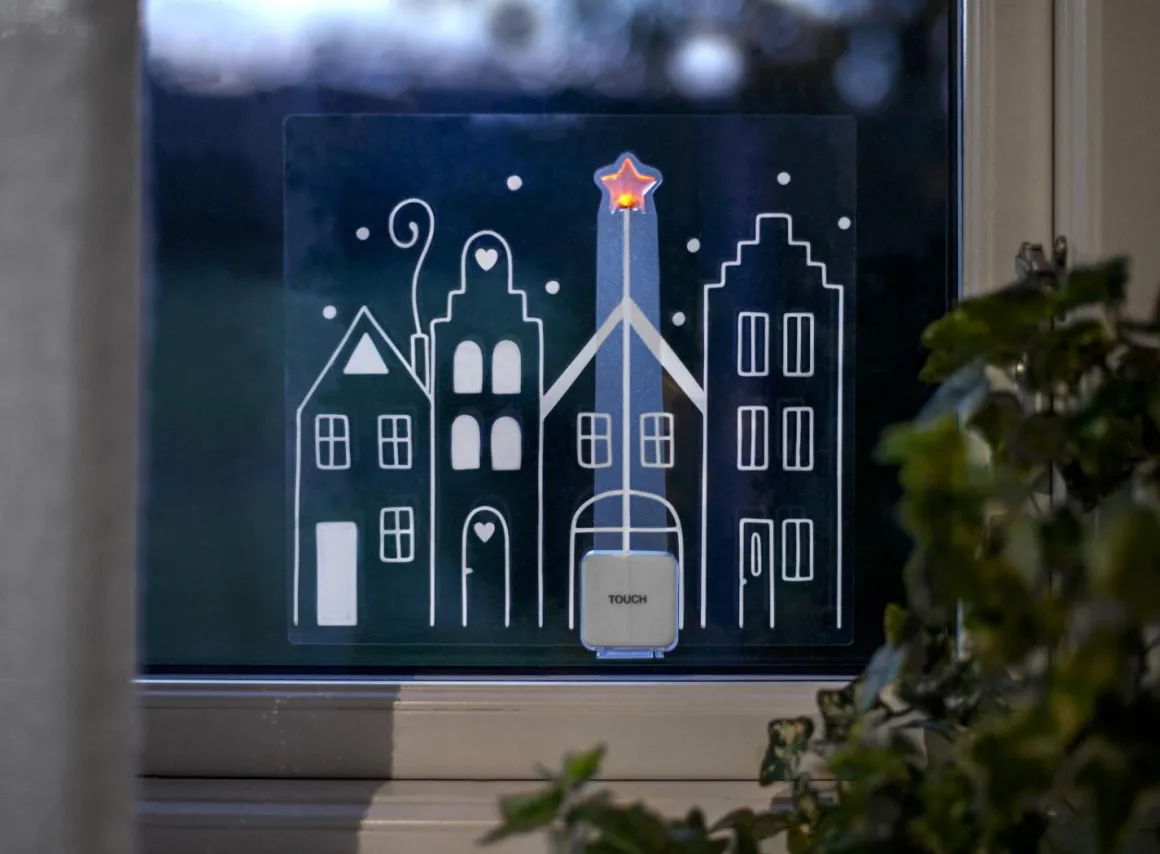 Festlig juldekoration i form av siluetten av fyra små hus. Denna fönsterdekoration kan fästas på ett fönster eller annan slät och ren yta som kylskåpet till exempel. Stjärnan som är ovanför husen lyser svagt och fint med ett varmt sken. Det är en ledljuspunkt som flammar stämningsfullt när produkten är på. Touch knapp med timer funktion. Hur festlig och kul som helst.