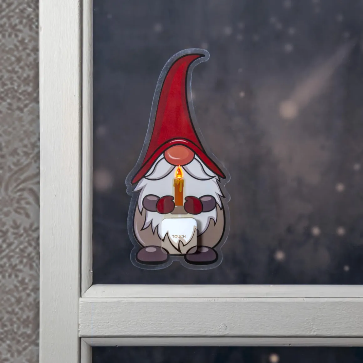 Festlig juldekoration i form av en tomte. Denna fönsterdekoration kan fästas på ett fönster eller annan slät och ren yta som kylskåpet till exempel. Ljuset som tomten håller i lyser svagt och fint. Det är en ledljuspunkt som flammar stämningsfullt när produkten är på. Touch knapp med timer funktion. Hur festlig och kul som helst.