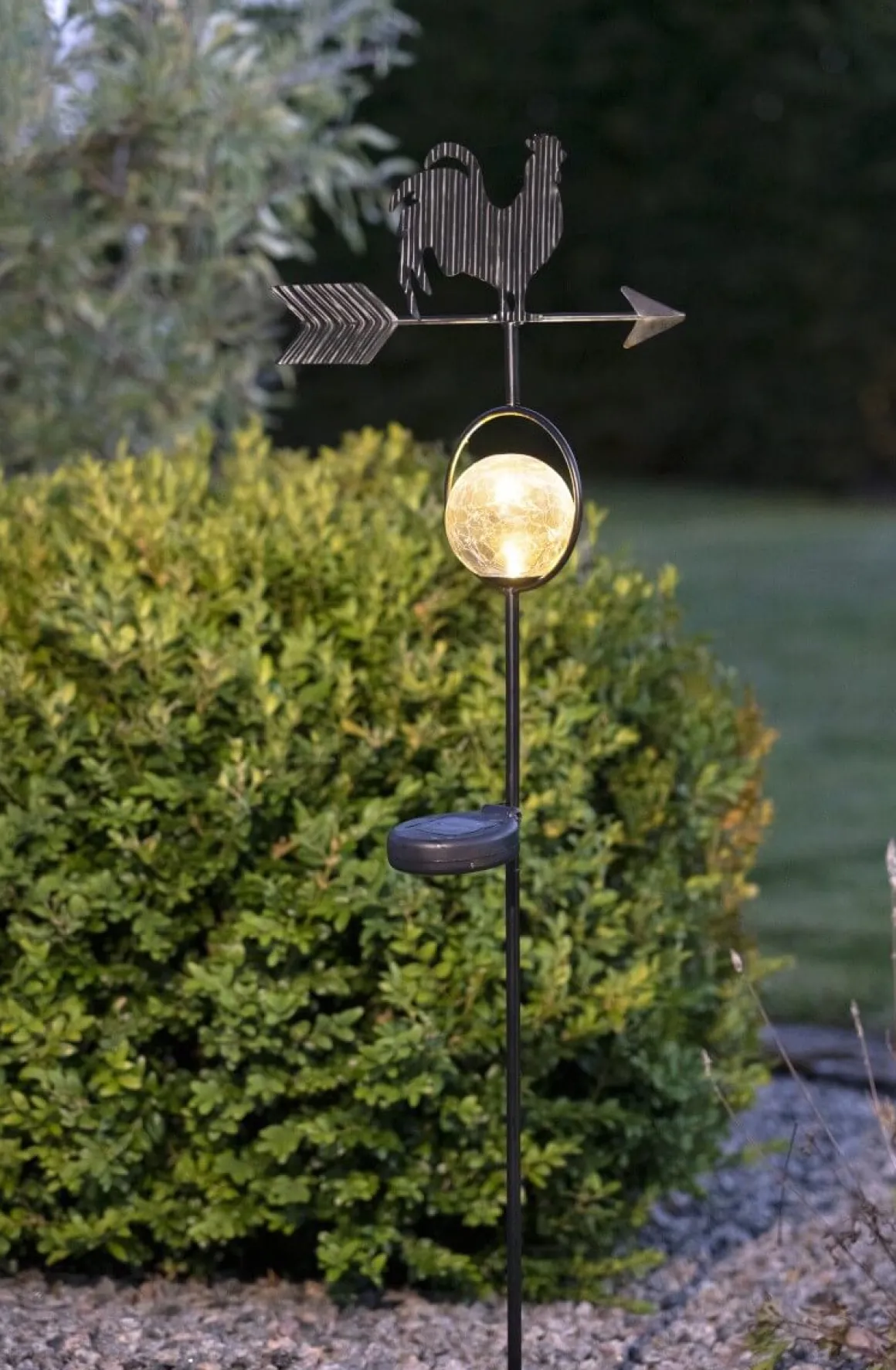 Solcellsdekoration i form av vindflöjel med tupp och vindriktningspilar från Star Trading. Ett varmvitt sken lyser under natten genom den krackelerade glaskulan.